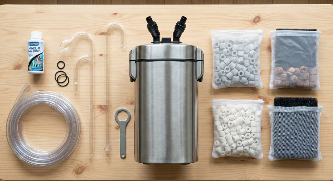 Außenfilter stehen im Unterschrank oder neben dem Aquarium. Das Wasser wird über Schläuche aus dem Tank und wieder zurück geleitet. Sie bieten das größte Volumen für Filtermedien und somit eine sehr hohe biologische Reinigungsleistung – ideal für größere Aquarien.